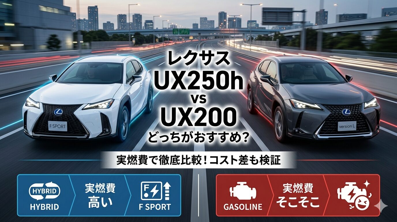 今回は都会的なサイズ感で人気の高いプレミアムコンパクトSUVについて、ハイブリッドモデルとガソリンモデルのどちらを選ぶべきか悩んでいるあなたに向けてじっくりお話ししていきます。レクサスUX250hとUX200を比較してみると、カタログに載っている燃費の数字だけでは見えてこない実燃費の違いや、ハイブリッドとガソリンの価格差を日々の維持費で本当に埋められるのかといった疑問が次々と湧いてきますよね。