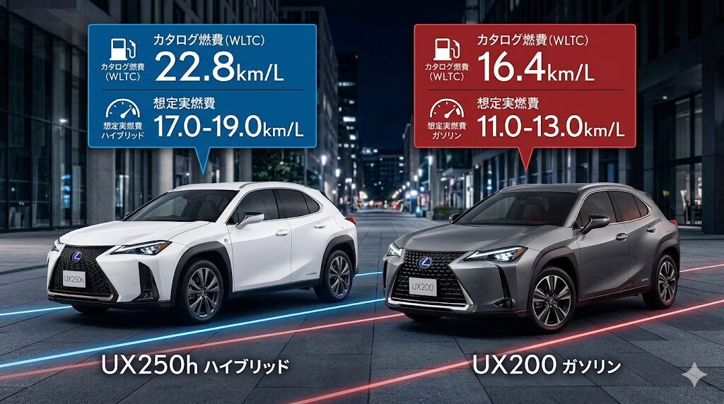 車を検討する際、まずはカタログに記載されているWLTCモード燃費に目を通す方が多いかなと思います。UX250h(2WD)のカタログ燃費はおおよそ22.8km/L、一方でガソリンモデルのUX200(2WD)はおおよそ16.4km/Lとなっています。これだけ見るとハイブリッドの圧勝に見えますが、実際の公道ではエアコンの使用や信号待ち、渋滞など様々な要因が絡んでくるため、カタログ値の約7割から8割程度が実燃費の目安になると考えておくのが現実的です。