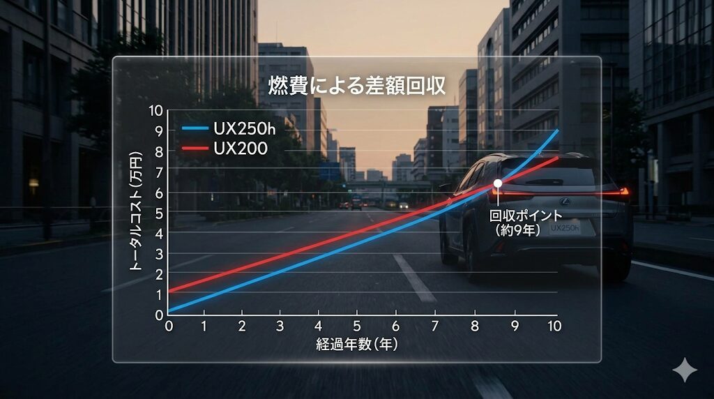 単純計算ですが、元を取るには約9年近く、距離にして約9万キロ走る必要があるという結果になります。もし年間走行距離が5,000km程度の週末利用メインの方であれば、回収には15年以上かかる計算になります。つまり、「純粋なお金の損得勘定」だけでハイブリッドを選ぶのは、実はあまり合理的ではないケースが多いのです。コスト面だけで言えば、初期費用が安いUX200の方がトータルの出費を抑えられる可能性は十分にあります。