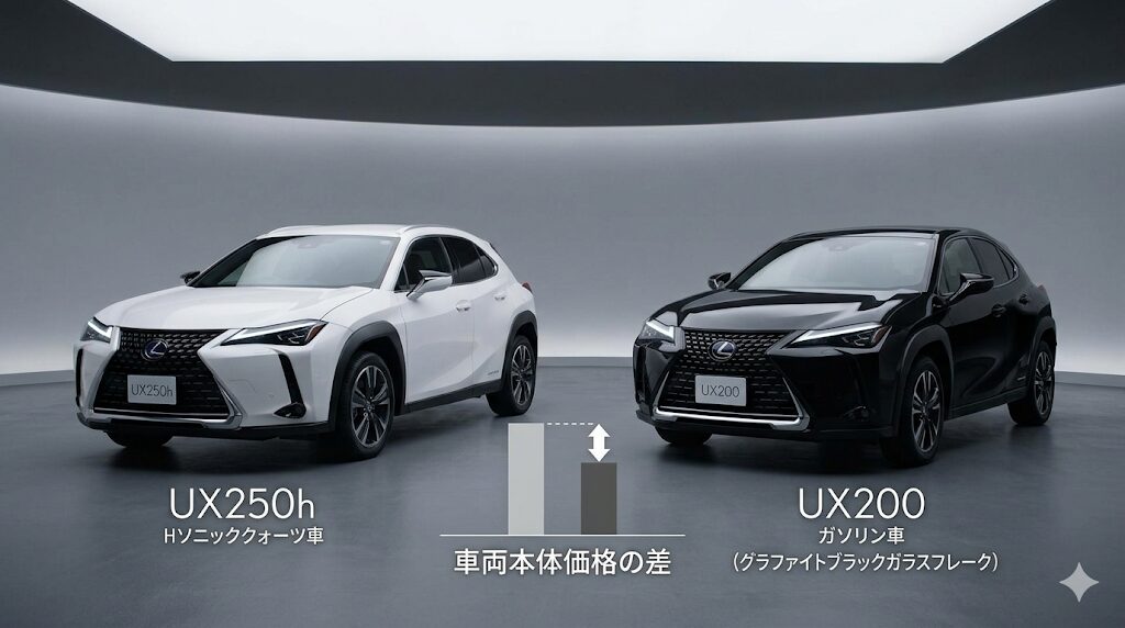 新車販売時の価格設定を振り返ってみると、同じグレード同士で比較した場合、ハイブリッドのUX250hとガソリンのUX200の間には、おおよそ35万円から40万円程度の価格差がありました。これはハイブリッドシステムという高度な技術と、駆動用バッテリーを搭載しているためのコストです。