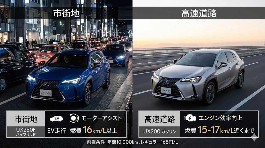 一方で、一定の速度で走り続ける高速道路になると、少し状況が変わってきます。高速巡航時はエンジンの効率が最も良くなるため、UX200も本領を発揮し、15km/L〜17km/L近くまで燃費が伸びることも珍しくありません。もちろんUX250hも高速燃費は優秀ですが、市街地ほどの劇的な差は生まれにくくなるため、週末の高速ドライブがメインという方であれば、ガソリンモデルのUX200でも十分に満足できるかもしれません。