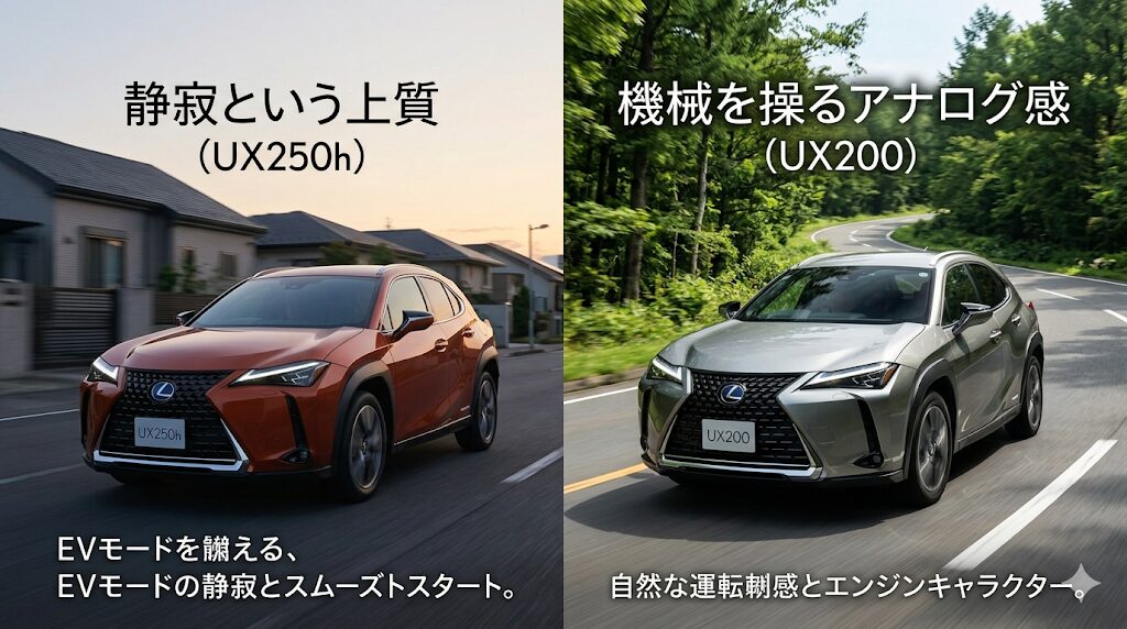 UX200も遮音性は高いですが、やはりアイドリング時のエンジンの振動や音は物理的にゼロにはなりません。しかし、逆に言えば適度なエンジン音がドライビングの心地よいスパイスになることも事実です。「静けさという上質」を選ぶか、「機械を操るアナログな感覚」を選ぶか、ここは完全に好みの分かれるところですね。