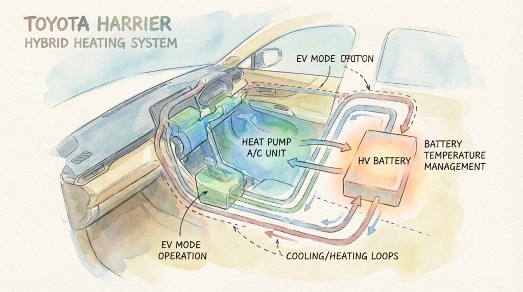 従来のハイブリッド車では、暖房使用時にエンジンを強制的に作動させる必要がありましたが、ハリアーではヒートポンプ技術によってこの問題を大幅に改善しています