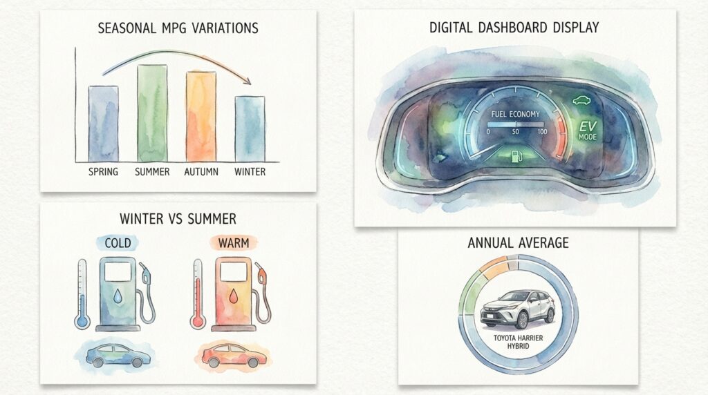 ハリアーハイブリッドの実燃費データを分析すると、明確な季節変動パターンが見えてきます。夏場のエアコン使用時と冬場の暖房使用時で、燃費への影響度合いが異なることが特徴的です