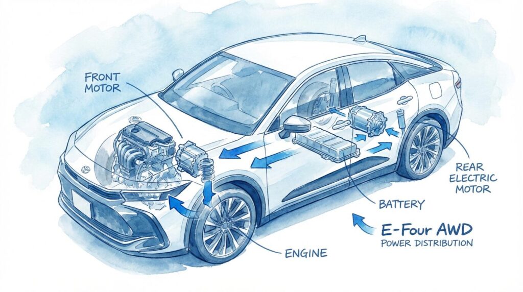 従来の機械式4WDと比較して、電気式であるE-Fourの利点は制御の精密さにあります。機械式では不可能な細かなトルク調整により、雪道特有の刻々と変化する路面状況に対応できるため、ドライバーは安心してアクセルを踏むことができます。