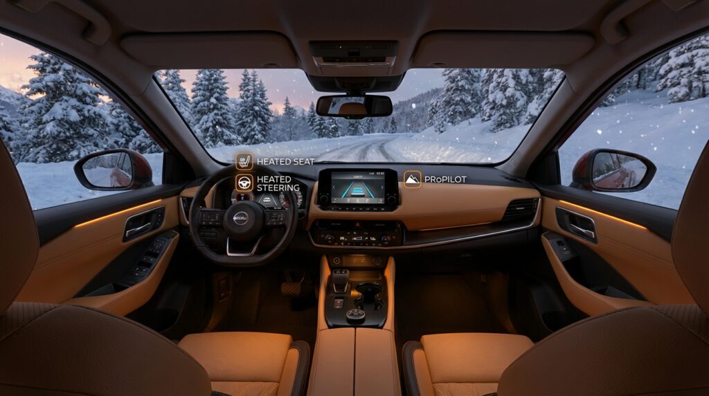 寒冷地仕様の主要装備として、シートヒーター、ステアリングヒーター、ヒーテッドドアミラーなどが設定可能であり、特にシートヒーターは暖房システムへの負荷を軽減することで、バッテリー消費の抑制と室内の快適性向上を両立する効果をもたらしています。