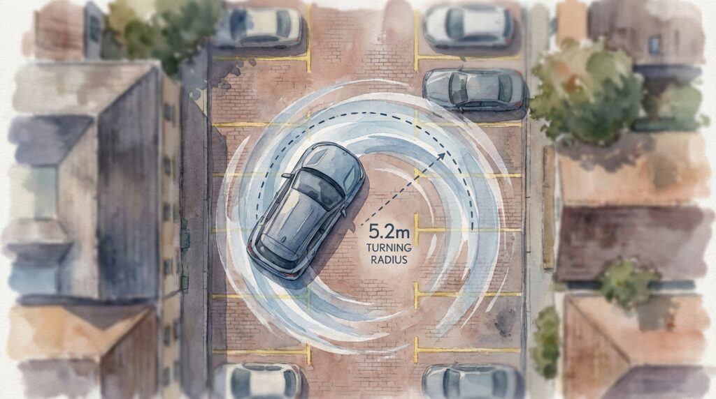 5.2mという回転半径があれば、一般的な住宅街の道路での切り返しや、商業施設の駐車場内での移動は問題なく行えます。ただし、非常に狭い路地や、古い立体駐車場のスロープでは、少し気を使う場面もあるかもしれません。