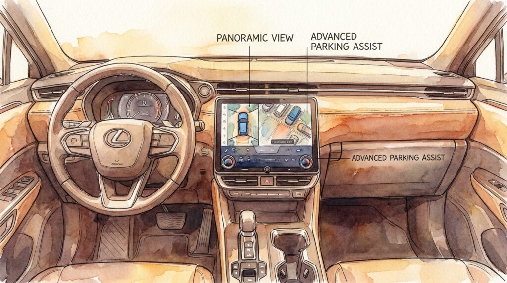 レクサスLBXには、駐車場での不安を解消する先進的な支援装備が用意されています。特にアドバンストパークは、駐車が苦手な方でも安心できる機能です。