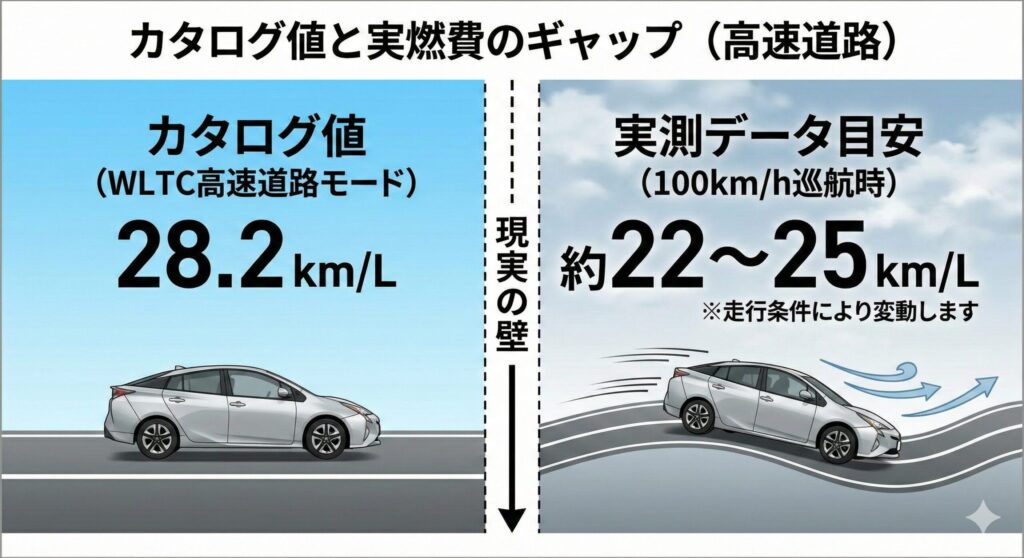 この数字だけ見れば「高速道路でも十分燃費が良い」と言えますが、カタログ値はあくまで一定の条件下での測定結果。実際の高速道路では、勾配、風向き、そして追い越し加速など、燃費を悪化させる要因が複雑に絡み合います。カタログ値と実燃費の乖離(かいり)は、一般的に「カタログ値の8割程度」と言われていますが、プリウスの場合はどうなのでしょうか。