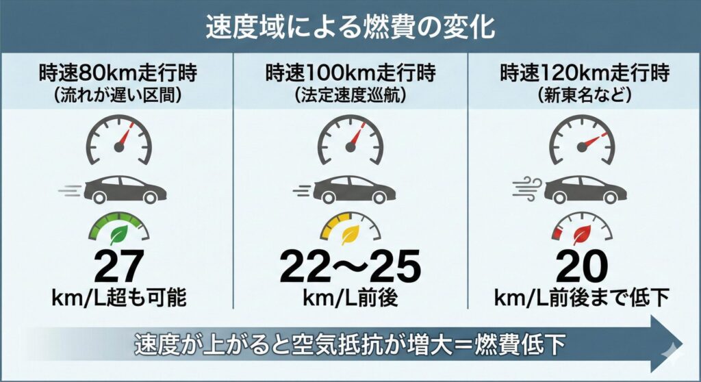 時速80kmから100kmに上げるだけで、燃料消費率は10〜15%程度悪化すると言われています。急いでいないなら、左車線をのんびり走るのが一番の燃費対策です。