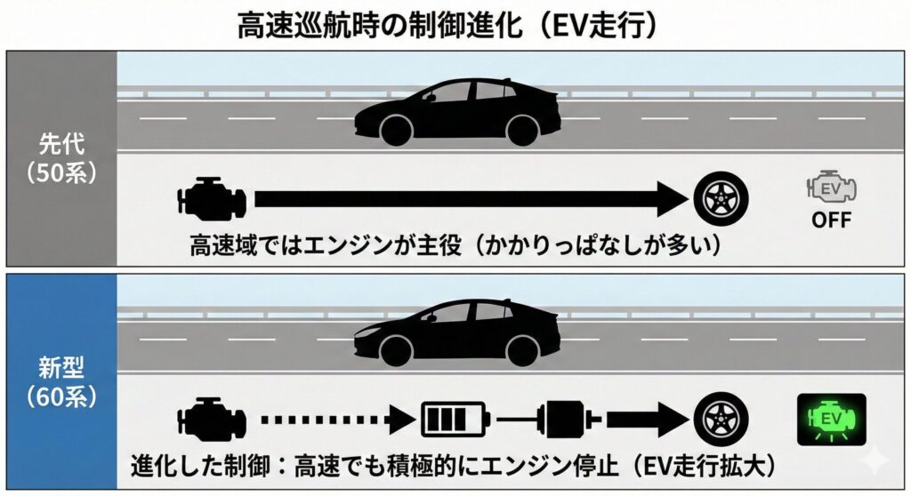 特に高速域での「エンジンの間欠運転」の制御が進化しています。以前のハイブリッド車は、高速域になるとエンジンがかかりっぱなしになることが多かったのですが、最新のTHS(トヨタ・ハイブリッド・システム)は、高速巡航中でも負荷が低い時は積極的にエンジンを止め、モーターだけで走行(EV走行)する領域が拡大しています。これにより、平坦な高速道路を淡々と走るようなシーンでは、排気量アップによる燃費悪化を最小限に抑えているのです。
