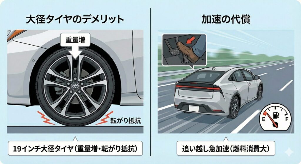 新型プリウスの見た目を劇的にカッコよくしているのが、あの19インチの大径タイヤです。ZグレードやGグレードに標準装備されていますが、実はこれも燃費には逆風となります。