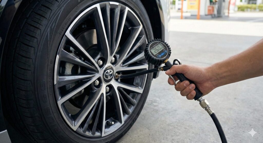 最後に見落としがちなのが「タイヤの空気圧」です。空気圧が規定値より低いと、タイヤが潰れて転がり抵抗が増え、燃費が悪化します。自転車のタイヤ空気が抜けていると漕ぐのが重いのと同じ理屈です。