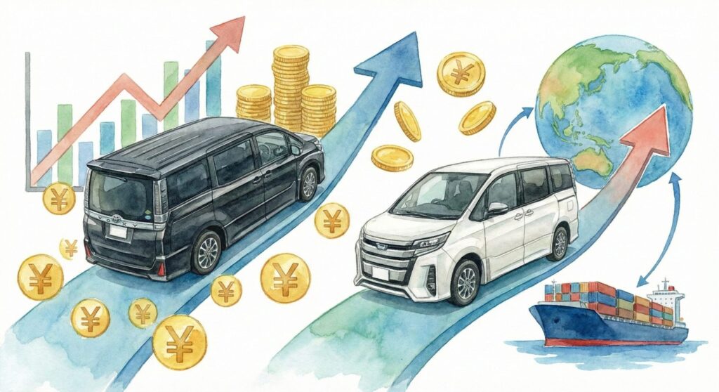 ではノアはリセールが悪いのかというと、決してそんなことはありません。特にノアの場合、海外輸出、特にアジア圏やアフリカ圏などへの輸出需要が非常に強く、国内の人気だけに左右されない底堅い相場を持っています。特に最近の傾向として、ガソリン車だけでなくハイブリッド車の輸出規制が緩和されている国も増えてきており、燃費が良く耐久性の高いトヨタのハイブリッドミニバンは、世界中で引く手あまたです。ヴォクシーが国内需要に支えられているのに対し、ノアはグローバルな需要に支えられているため、相場の暴落が起きにくいという安心感があります。