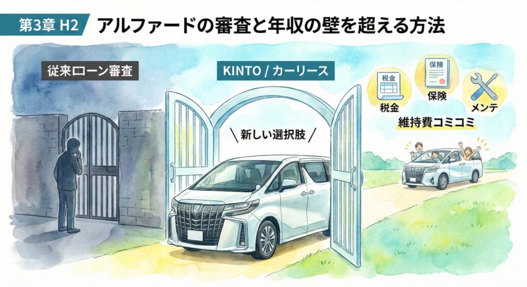 サブスクやメンテナンス込みのリースなら、ガソリン代と駐車場代以外はほぼフラットになります。家計管理が圧倒的に楽になるため、「年収ギリギリでアルファードに乗る」というチャレンジをする場合でも、生活破綻のリスクを最小限に抑えることができるんです。