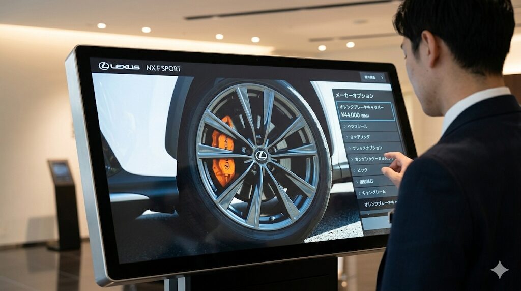 中古車市場において、レクサスNX Fスポーツを探しているユーザーの多くは、「スポーティな見た目」を求めています。そのため、オレンジキャリパーが装着されている車両は検索にヒットしやすく、販売店側も強気の価格設定ができるため、結果として買取査定額がプラスに働きやすい傾向にあります。44,000円という初期投資が、数年後の売却時にそのまま、あるいはそれ以上の価値となって返ってくる可能性が高いという点でも、非常におすすめできるオプションです。