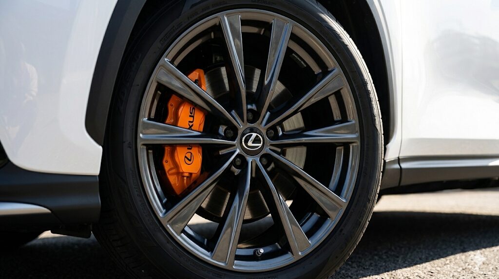 レクサスNX Fスポーツの大きな魅力の一つが、専用装備である20インチアルミホイールです。スーパーグロスブラックメタリック塗装など、ダーク系の引き締まったカラーリングが特徴ですが、このダーク系ホイールとオレンジキャリパーの相性は、まさに計算し尽くされた完璧なマッチングと言えます。