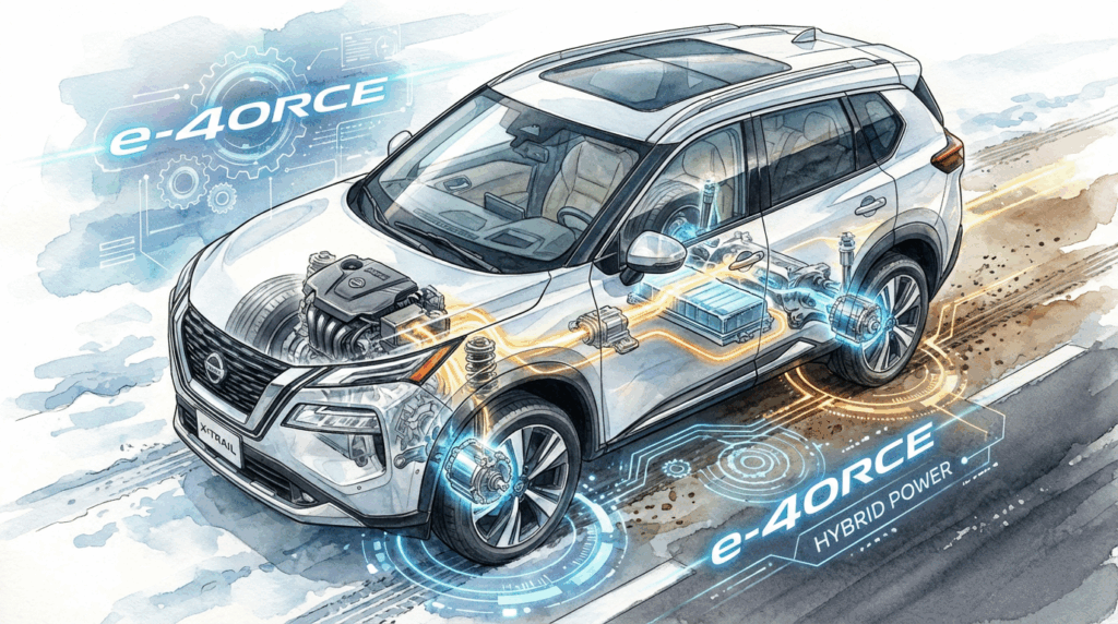 エクストレイルハイブリッドが雪道でどこまで実力を発揮できるのか、まずは核となるe-4ORCEシステムとハイブリッド技術の組み合わせから詳しく見ていきましょう。日産が誇る電動4WDシステムe-4ORCEは、従来の機械式4WDとは全く異なるアプローチで雪道走行をサポートしてくれます。